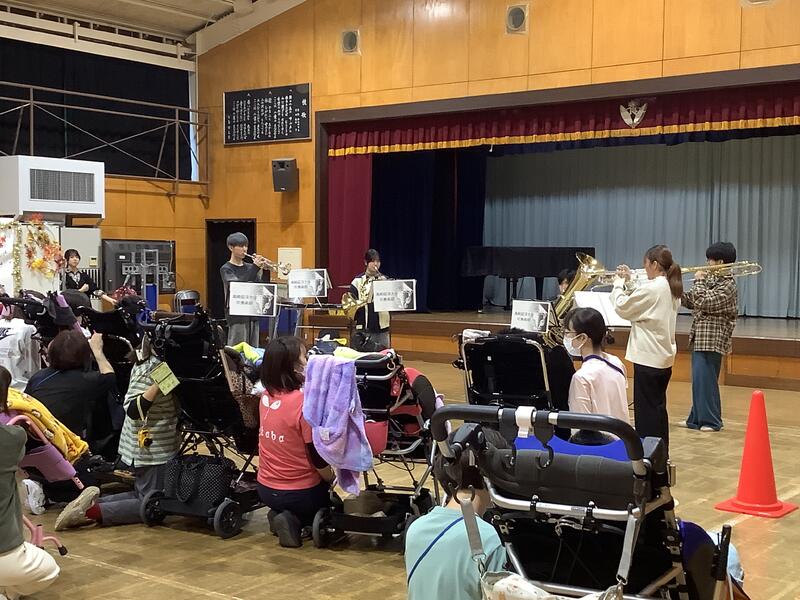 休憩中や演奏後は児童生徒の近くで楽器を演奏してくれたり、楽器を触らせてくれたりして、体育館がとても楽しい雰囲気で満たされました。